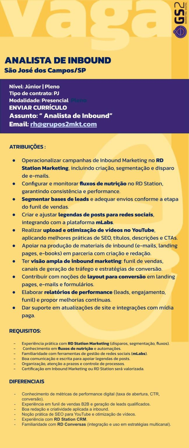 Curtiu? Então envie seu currículo para: rh@grupos2mkt.com