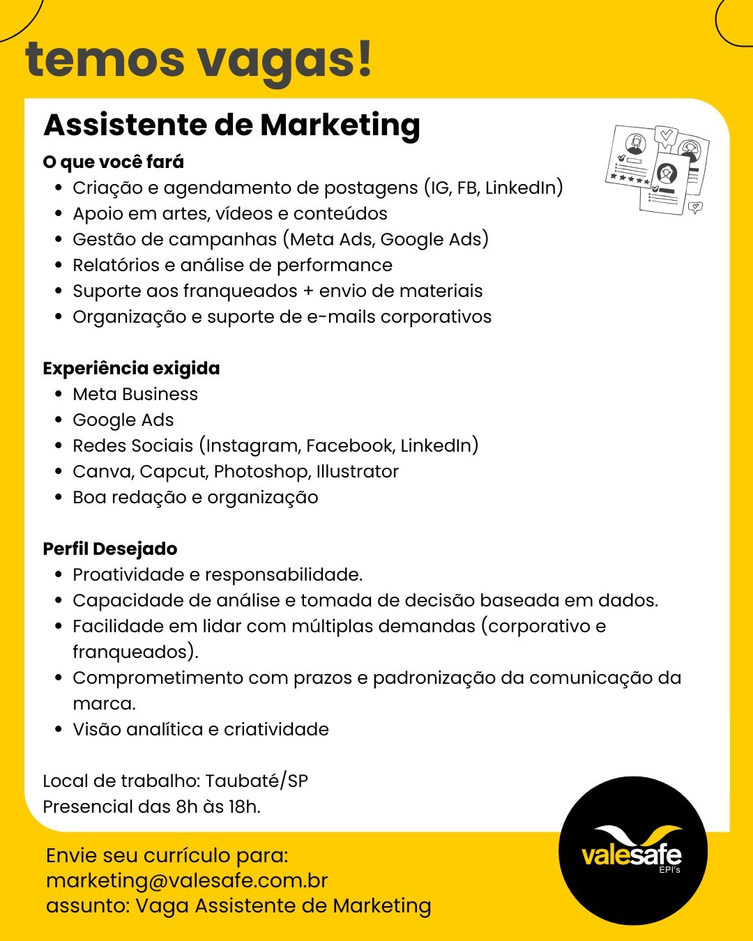 A ValeSafe EPIs, maior rede de franquias de EPIs do Brasil, busca Assistente de Marketing para atuar com mídias sociais, tráfego pago e suporte à nossa rede franqueada.