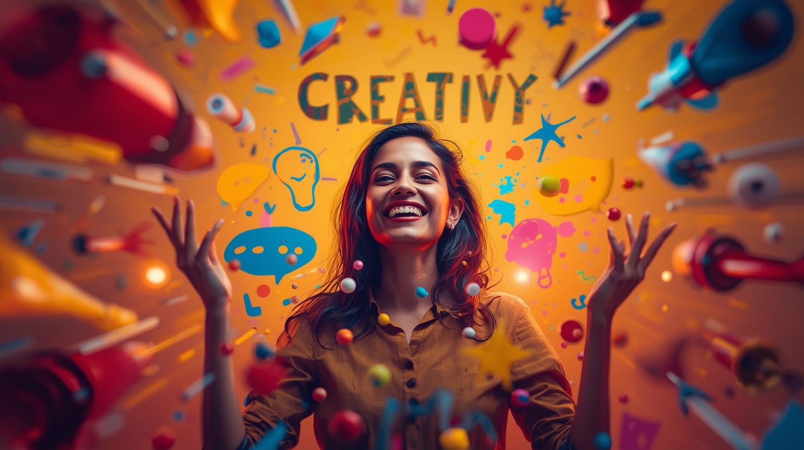 Crie uma imagem de uma mulher criativa, que atua em propaganda. Ela deve estar no centro da imagem, com um aspecto confiante e alegre e rodeada de icones e referências de criatividade. Publicado 23 de fevereiro de 2026 às 1600 × 896 em Fim do “achismo criativo”: AdTech brasileira lança plataforma que explica, com dados, por que um anúncio vende