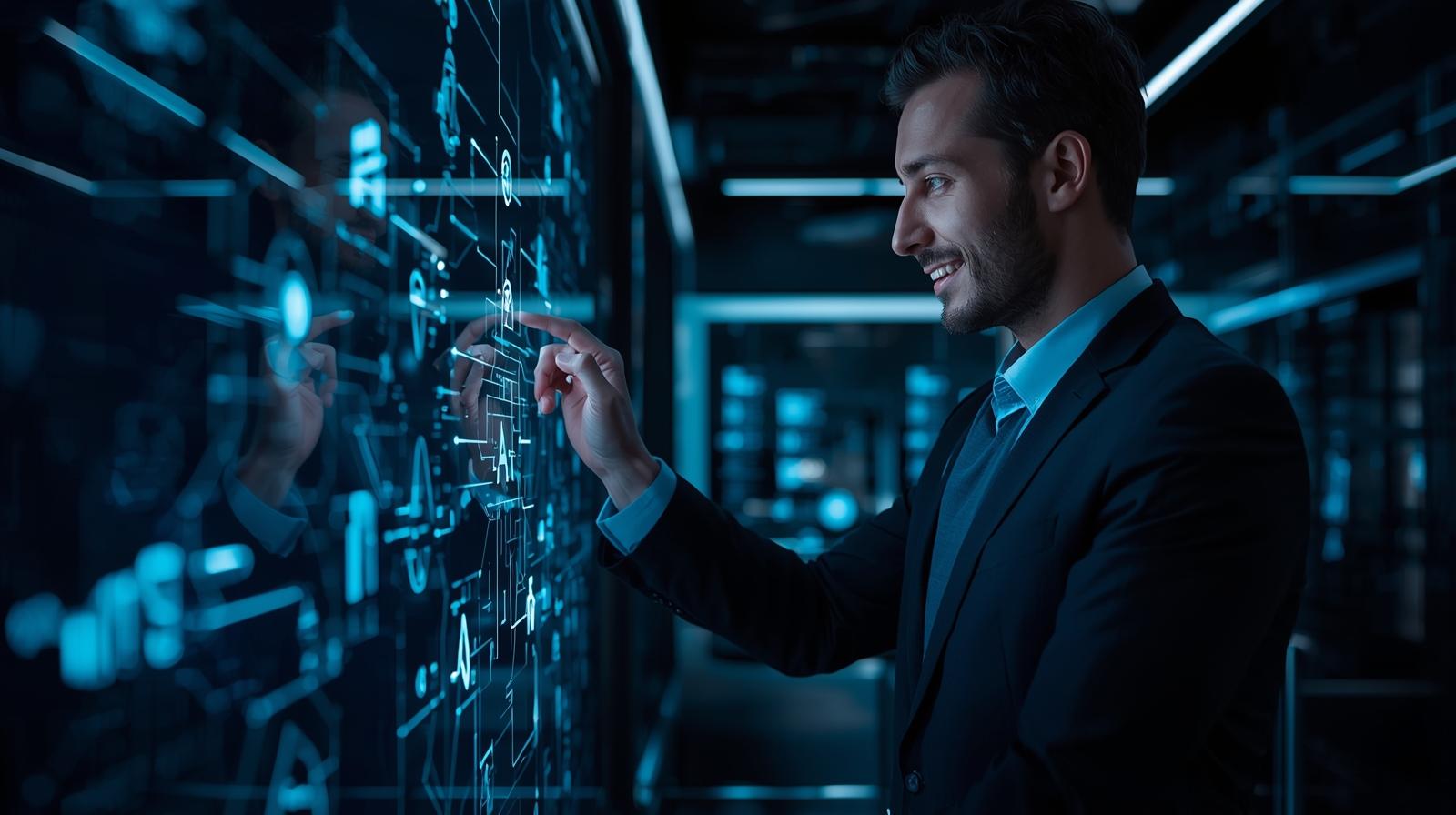 Crie uma imagem que mostre a interação entre o homem e a máquina, dentro de uma biente de marketing e tecnologia Publicado 24 de outubro de 2025 às 1600 × 896 em Olhando para 2026: qual será a grande tendência?
