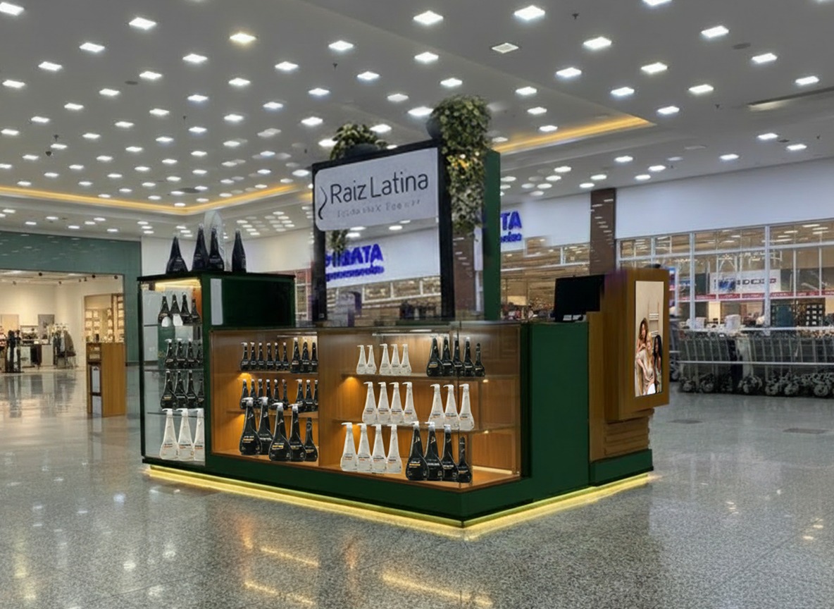 O quiosque da Raiz Latina contará com mais de 130 itens das linhas de cosmética capilar da linha tradicional a linha premium RL, com produtos para profissionais da beleza e home care.