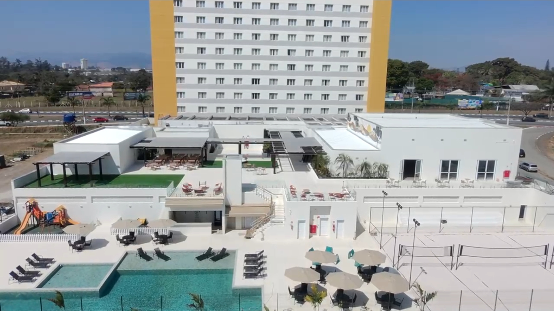 A nova área de lazer e convivência, com 2,5 mil m², foi cuidadosamente planejada para atender famílias, casais e grupos que buscam experiências completas. O espaço reúne piscinas adulto e infantil climatizadas, espaço kids com programação especial para crianças, espaço pet para hóspedes que viajam com seus animais, redário para descanso, além de uma arena beach com três quadras para a prática de vôlei de praia e futevôlei. Dois bares estrategicamente posicionados garantem comodidade, enquanto o spa com salas de massagem, sauna e salão de beleza oferecem opções de relaxamento. Para atender à crescente demanda, o estacionamento também foi ampliado, ganhando 80 novas vagas.