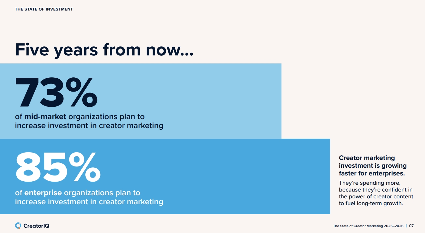 The State of Creator Marketing Report 2025-2026 – CreatorIQ 73% das empresas de médio porte e 85% das corporações afirmam que planejam aumentar seus aportes em marketing de influenciadores nos próximos cinco anos.
