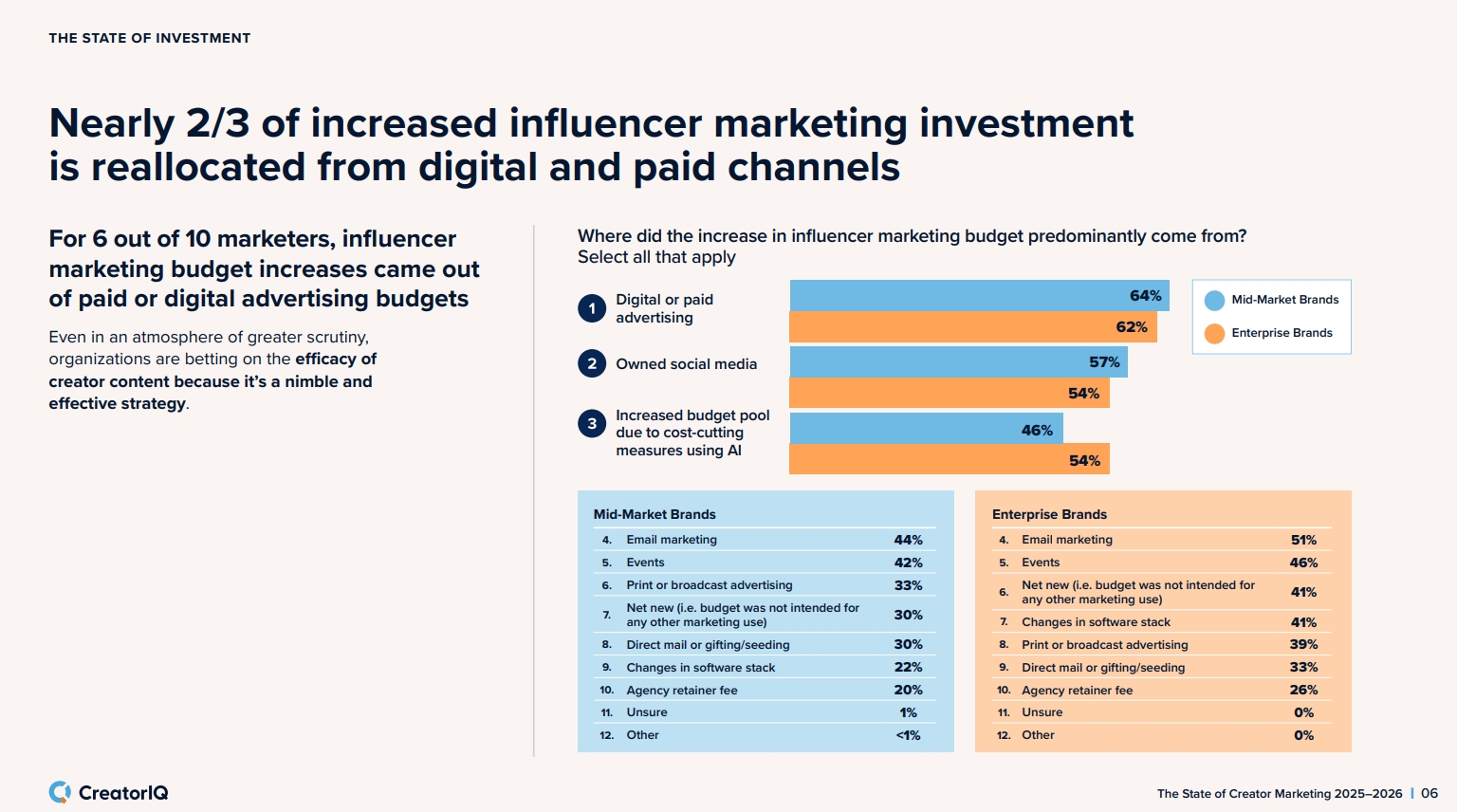The State of Creator Marketing Report 2025-2026 – CreatorIQ O levantamento mostra ainda que 64% dos profissionais do setor disseram que os aumentos de orçamento vieram de canais pagos ou digitais