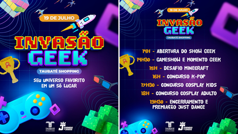 O universo pop vai tomar conta do Taubaté Shopping, administrado pelo Grupo AD, neste sábado (19) com a chegada da Invasão Geek, evento totalmente gratuito que promete reunir fãs de games, animes e cultura nerd. A iniciativa é realizada em parceria com a Torneio de Jogos, empresa referência em campeonatos gamers no Brasil e idealizadora do Festival Gamer e Geek, evento itinerante que já percorreu diversos estados do país.