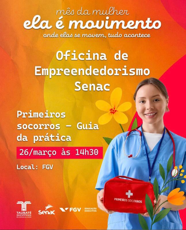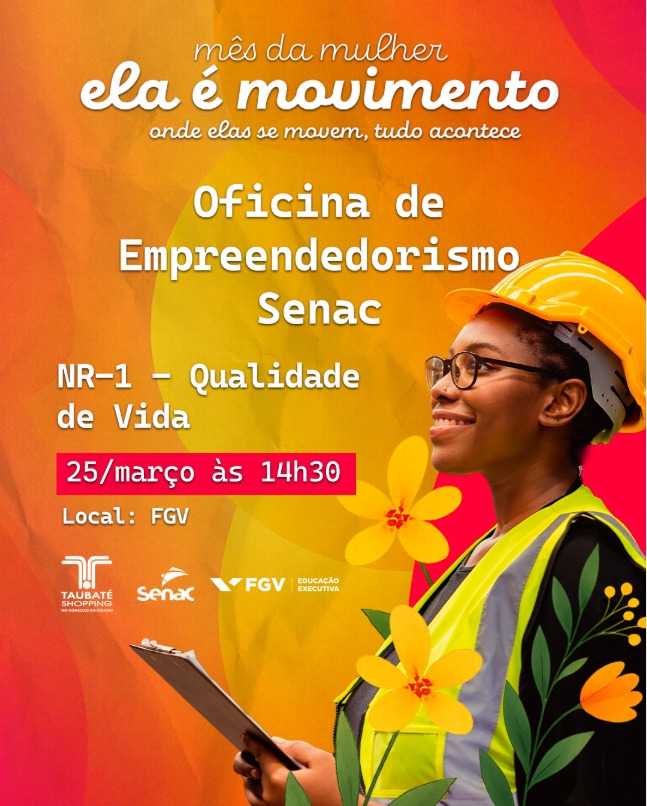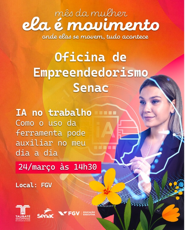 No Mês das Mulheres, o Taubaté Shopping, administrado pelo Grupo AD, realiza mias uma iniciativa especial para o público feminino. Entre os dias 24 e 26 de março, o empreendimento, em parceria com o Senac, promove uma programação de oficinas gratuitas, com temas voltados ao desenvolvimento pessoal e profissional. As atividades acontecem às 14h30, na FGV (próximo à academia Ultra).